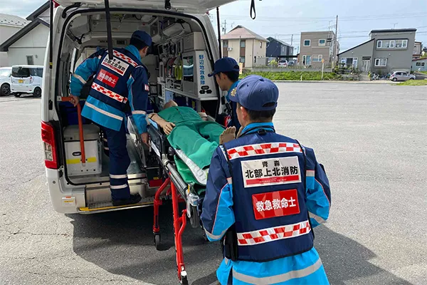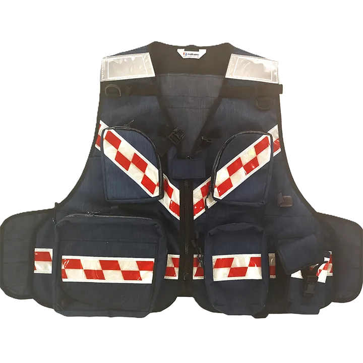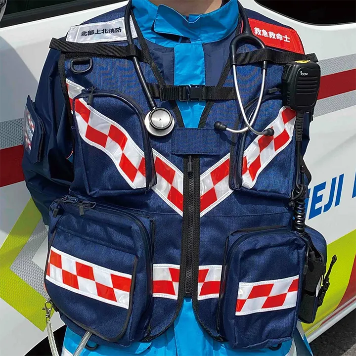 ・ベスト外観に救急車両のバッテンバーグ・マーキングを入れて活動隊員の視認性向上 ・聴診器や無線機を引っかけるようにPPテープ取付 ・救急活動の使用頻度の高いペンライト、医療用ハサミを収納